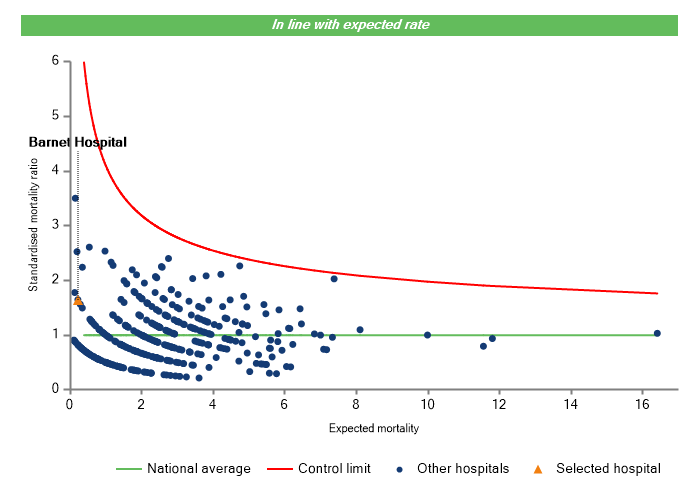 The vertical axis figures are presented as a standardised mortality ratio. This means the values do not represent percentages of patients who have died, but they represent the proportion of deaths compared to the national average. The data is also ‘risk adjusted’ to take account of the fact that different hospitals may operate on more higher-risk or lower-risk patients e.g. because of demographics in the patient population they work with.