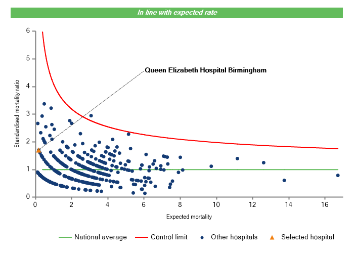 The vertical axis figures are presented as a standardised mortality ratio. This means the values do not represent percentages of patients who have died, but they represent the proportion of deaths compared to the national average. The data is also ‘risk adjusted’ to take account of the fact that different hospitals may operate on more higher-risk or lower-risk patients e.g. because of demographics in the patient population they work with.