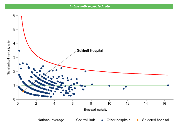 The vertical axis figures are presented as a standardised mortality ratio. This means the values do not represent percentages of patients who have died, but they represent the proportion of deaths compared to the national average. The data is also ‘risk adjusted’ to take account of the fact that different hospitals may operate on more higher-risk or lower-risk patients e.g. because of demographics in the patient population they work with.