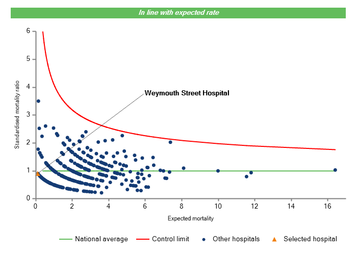 The vertical axis figures are presented as a standardised mortality ratio. This means the values do not represent percentages of patients who have died, but they represent the proportion of deaths compared to the national average. The data is also ‘risk adjusted’ to take account of the fact that different hospitals may operate on more higher-risk or lower-risk patients e.g. because of demographics in the patient population they work with.