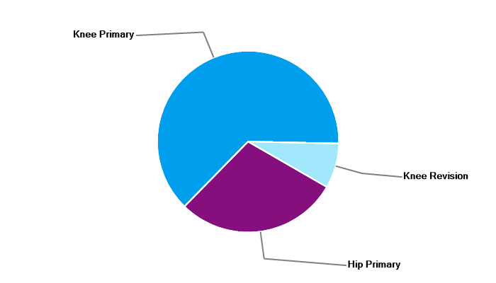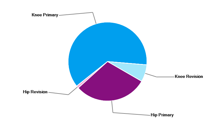Primary hip replacement Revision hip replacement Primary total knee replacement Primary unicondylar (partial) knee replacement Primary patello-femoral replacement Revision knee replacement |