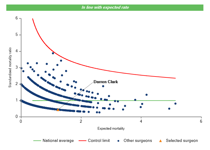 The vertical axis figures are presented as a standardised mortality ratio. This means the values do not represent percentages of patients who have died, but they represent the proportion of deaths compared to the national average. The data is also risk adjusted to take account of the fact that different surgeons may operate on more higher-risk or lower-risk patients e.g. because of demographics in the patient population they work with.