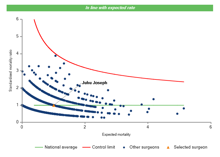 The vertical axis figures are presented as a standardised mortality ratio. This means the values do not represent percentages of patients who have died, but they represent the proportion of deaths compared to the national average. The data is also risk adjusted to take account of the fact that different surgeons may operate on more higher-risk or lower-risk patients e.g. because of demographics in the patient population they work with.