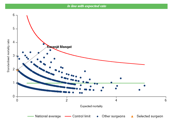 The vertical axis figures are presented as a standardised mortality ratio. This means the values do not represent percentages of patients who have died, but they represent the proportion of deaths compared to the national average. The data is also risk adjusted to take account of the fact that different surgeons may operate on more higher-risk or lower-risk patients e.g. because of demographics in the patient population they work with.