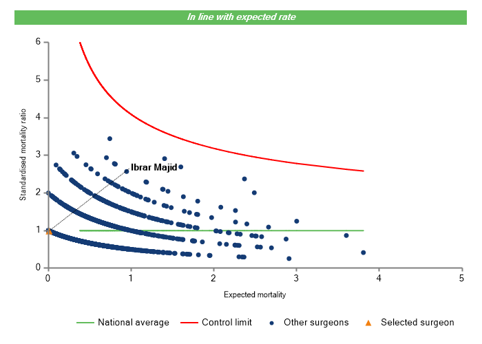 The vertical axis figures are presented as a standardised mortality ratio. This means the values do not represent percentages of patients who have died, but they represent the proportion of deaths compared to the national average. The data is also risk adjusted to take account of the fact that different surgeons may operate on more higher-risk or lower-risk patients e.g. because of demographics in the patient population they work with.