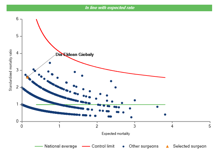 The vertical axis figures are presented as a standardised mortality ratio. This means the values do not represent percentages of patients who have died, but they represent the proportion of deaths compared to the national average. The data is also risk adjusted to take account of the fact that different surgeons may operate on more higher-risk or lower-risk patients e.g. because of demographics in the patient population they work with.
