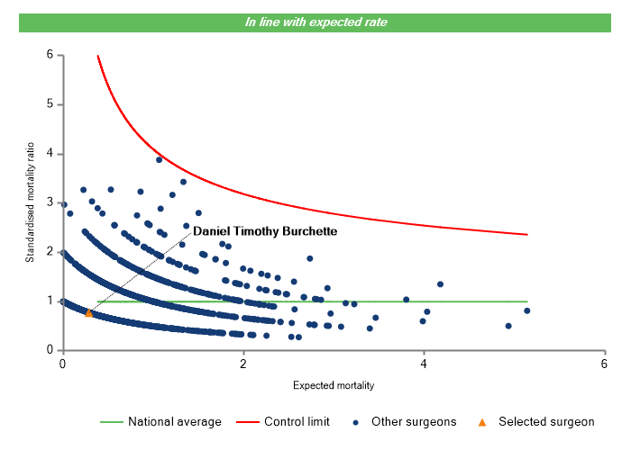 The vertical axis figures are presented as a standardised mortality ratio. This means the values do not represent percentages of patients who have died, but they represent the proportion of deaths compared to the national average. The data is also risk adjusted to take account of the fact that different surgeons may operate on more higher-risk or lower-risk patients e.g. because of demographics in the patient population they work with.