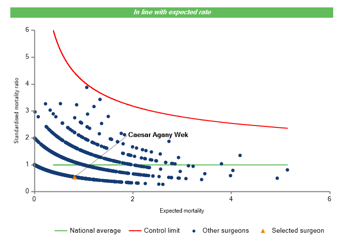 The vertical axis figures are presented as a standardised mortality ratio. This means the values do not represent percentages of patients who have died, but they represent the proportion of deaths compared to the national average. The data is also risk adjusted to take account of the fact that different surgeons may operate on more higher-risk or lower-risk patients e.g. because of demographics in the patient population they work with.