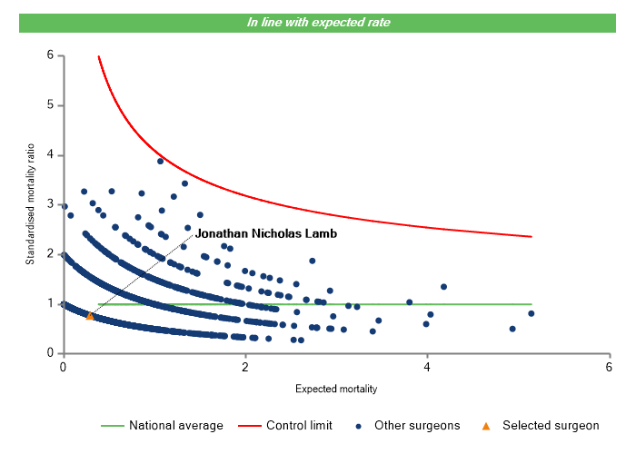 The vertical axis figures are presented as a standardised mortality ratio. This means the values do not represent percentages of patients who have died, but they represent the proportion of deaths compared to the national average. The data is also risk adjusted to take account of the fact that different surgeons may operate on more higher-risk or lower-risk patients e.g. because of demographics in the patient population they work with.